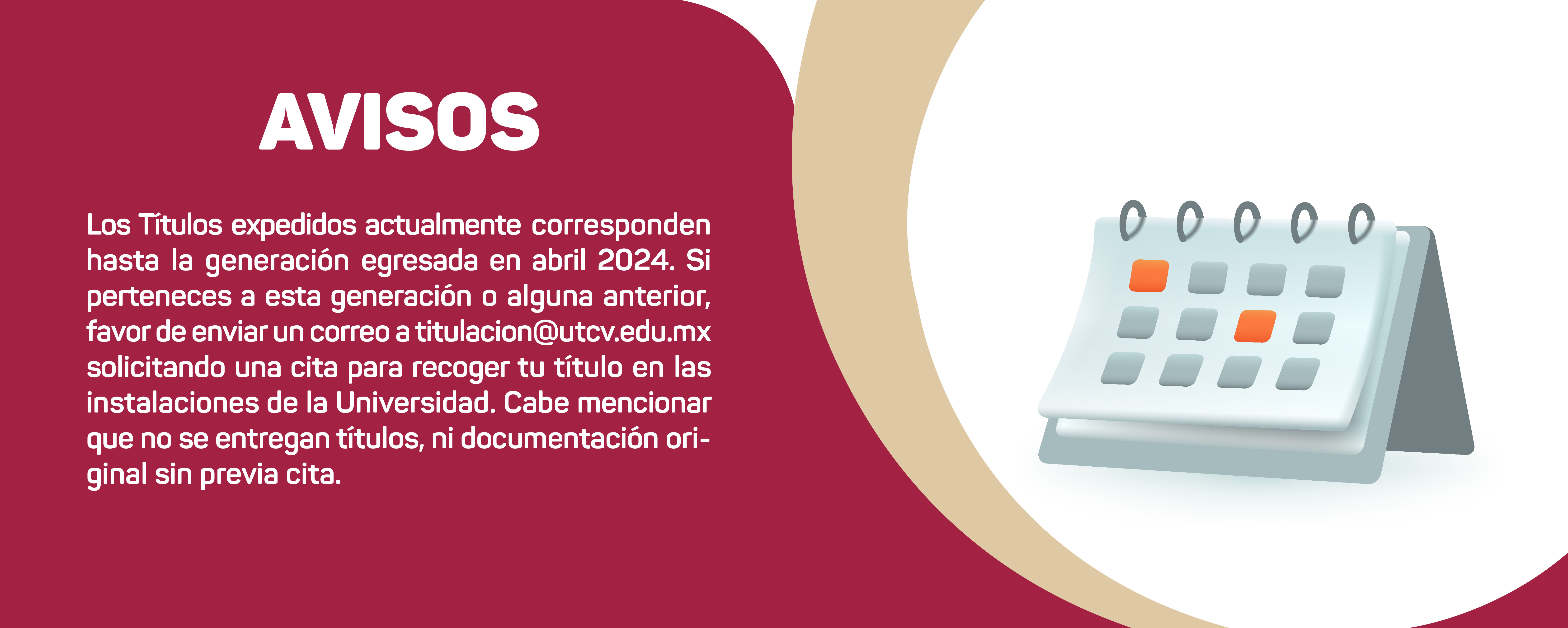 La Universidad Tecnológica del Centro de Veracruz (UTCV), a través del departamento de Titulación, realiza los trámites de título profesional a toda la comunidad estudiantil que concluyó satisfactoriamente su programa de estudios y la estadía, mediante la recepción de documentación, gestión ante instancias educativas, resguardo y entrega de documentos.